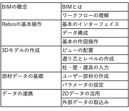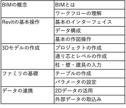 これらのカリキュラムはあくまで参考例となりますが、BIMの基本概念、3Dモデルの作成、パラメータ設定などを、実践的な内容でしっかりと学ぶことができます。